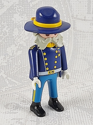 Capitan in blauer Uniform mit aufgedruckten gelben Knopfreihen, gelber Kragen - graue Haare und Backenbart, weiße Hände