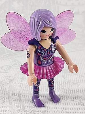 Frau mit lila Haaren, lila gekleidet, magenta Minirock, lila Flügelhalter und magenta Flügel