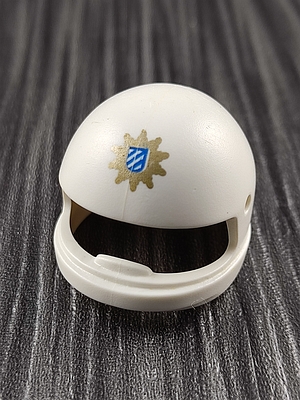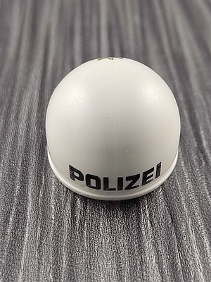 weißer Polizeihelm mit Aufdruck - vorne: Polizei-Wappen goldener Stern und blau/weiße Streifen, hinten: "Polizei"