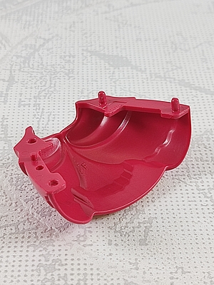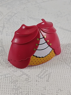 vordere Rockhälfte, pink mit weiß-gelben Muster und goldenen Knöpfen