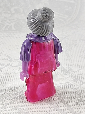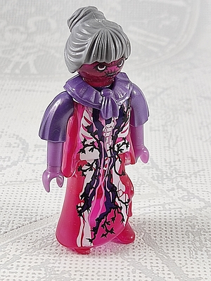 Frau, pink/transparentes Kleid, halblange lila Ärmel, pink/transparentes Gesicht, lila Halstuch, graue Haare