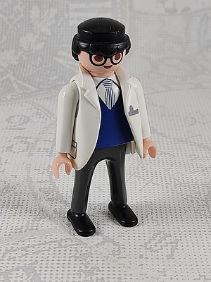 Mann mit Brille, weiße Jacke, blauer Pulli, Krawatte, dunkelgraue Hose, schwarze Schuhe