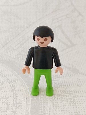 Junge, grüne Hose, schwarzer Pullover mit Aufdruck "playmobil" auf dem Rücken