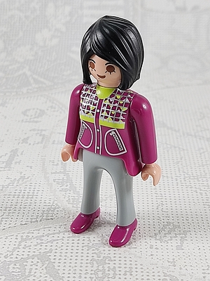 Frau, Jacke und Schuhe magenta, Hose hellgrau