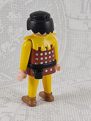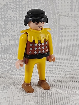 Mann, brauner Oberkörper mit silbernen Punkten / Kreisen, gelbe Arme und Beine, gelber Schulterkragen, schwarzer Gürtel