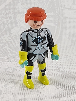 Agent Dr. Drone mit gelben Arm-Manschetten, Sommersprossen, Hände türkis, Aufdruck "D" auf der Brust, rot-braune Haare