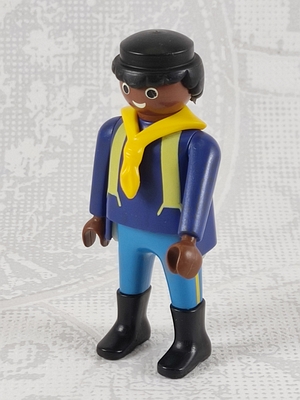 Mann in blauer Uniform mit aufgedruckten gelben Hosenträgern und gelben Halstuch - dunkle Haut