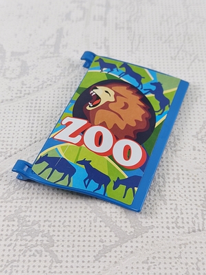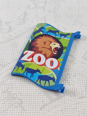 große rechteckige, blaue Fahne mit Aufkleber auf beiden Seiten