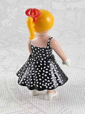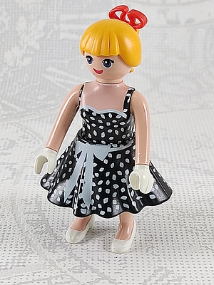 Frau in schwarzem Kleid mit weißen Punkten, weiße Schuhe und Hände, rote Haarschleife