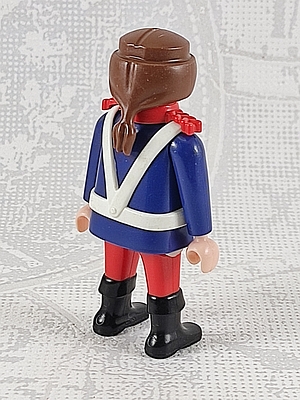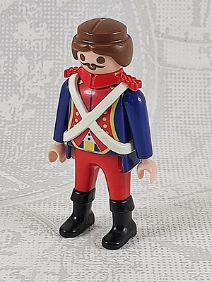 Soldat in d.blauer Uniformjacke mit roter Front, weißer gekreutzer Schultergurt, rote Schulterklappen, rote Hose, schwarze Stiefel - braune Haare, aufgedruckter Schnäuzer