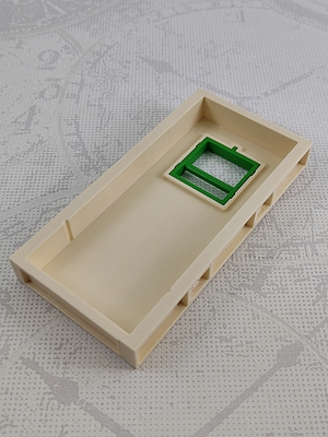 creme-farbende Stallwand mit kleinem, grünem Fenster