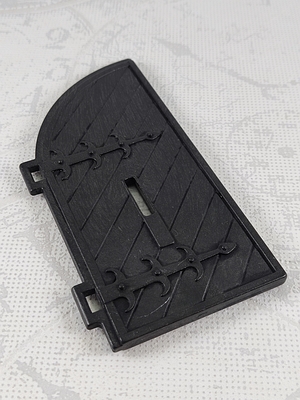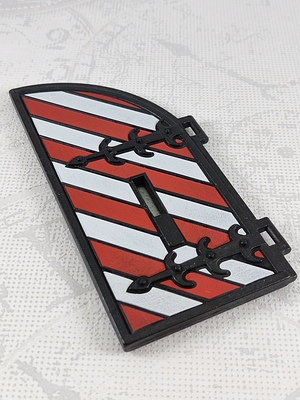 rechter Torflügel, eine obere Ecke abgerundet, schwarz mit roten und weißen diagonalen Streifen