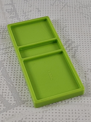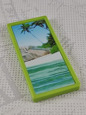 rechteckiger, hellgrüner Bilderrahmen mit Aufkleber: Strand, Palmen, Felsen, Meer