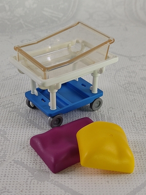 Bettrahmen weiß: 30201310, Rahmenbeine weiß: 30201360, Rahmen-Platte blau: 30201320, Rad-Achse grau: 30053750, Liege-Schale transparent: 30201330, Matratze magenta: 30201340, Bettdecke gelb: 30201350