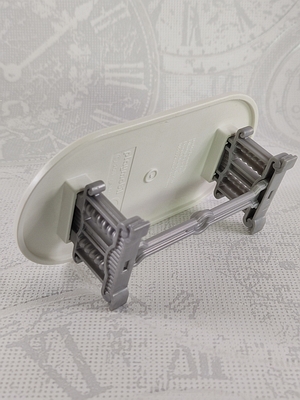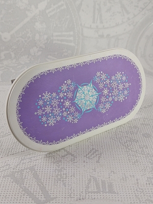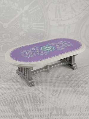 großer, ovaler Tisch mit lila Dekor und silbernen Tischgestell, ca. 12,8 cm lang und 6,5 cm breit, komplett, 4-teilig