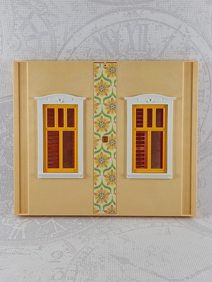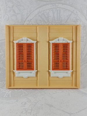 Wandelement gelb: 30517990_f, zwei Fensterrahmen außen weiß: 30214462, zwei Fensterrahmen innen weiß: 30214472, zwei Sprossenfenster 2x3 orange: 30214482, vier Fensterladen orange: 30517970_1, Blende gelb: 30214642, Blendenaufkleber: 30659912