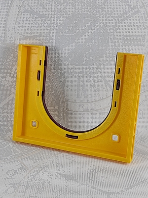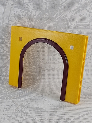 gelbe Wand mit Rundbogen und braunem Rundbogen-Rahmen, Reiterhof