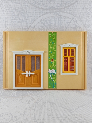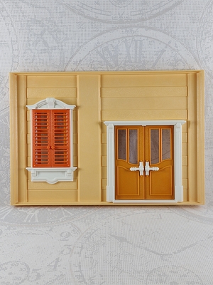 Wandelement gelb: 30517990_tf, Fensterrahmen außen weiß: 30214462, Fensterrahmen innen weiß: 30214472, Sprossenfenster 2x3 orange: 30214482, zwei Fensterladen orange: 30517970_1, Türrahmen außen weiß: 30214842, Türrahmen innen weiß: 30214862, zwei Türen orange: 30517950, zwei Türklinken 2-teilig weiß: 30608390, Blende gelb: 30214642, Blendenaufkleber grün: 30659922