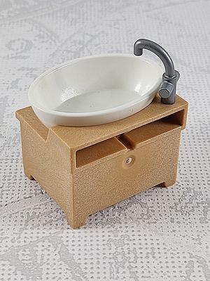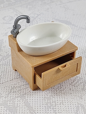 4-teiliger Waschtisch: Schubladenschrank beige mit Waschbecken weiß und Wasserhahn grau