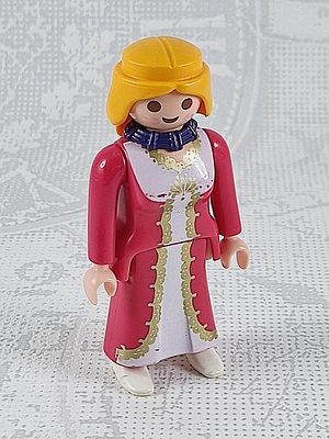 Frau im langen, d.pinken Kleid mit weiß und gold, d.blaue Halskette