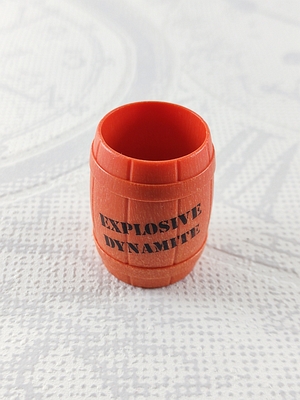 großes Holzfass orange mit schwarzer Aufschrift "Explosive Dynamite" ohne Deckel