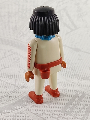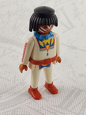Indianer in cremefarbender Kleidung mit rot-braunen Gürtel und blauem Halsschmuck, Gesichtsbemalung