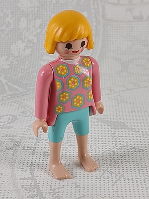 rosa Pulli mit gelben Blumen, kurze Hose türkis