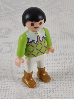 Junge, h.grüner Pulli, weiße Hose, goldene Stiefel