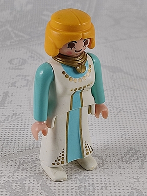 Frau langes Kleid weiß/türkis/gold; goldene Kette