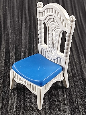 weißes Stuhlgestell mit Ornamenten und Stuhlkissen d.blau