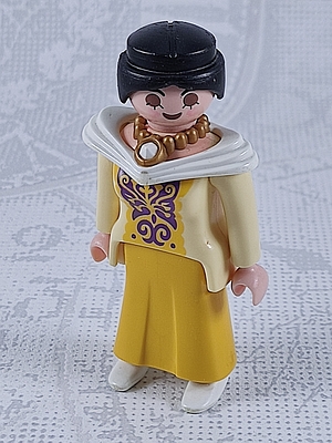 Frau im langen, gelben Kleid mit lila Muster, goldene Halskette mit weißem Anhänger (30205180)