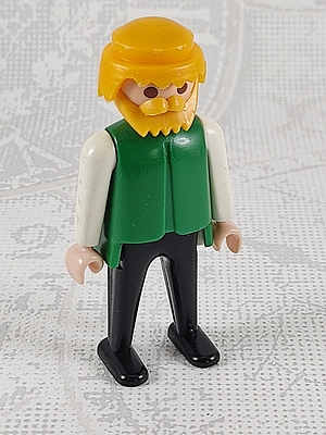 Farmer, grüner Pulli mit weißen Ärmeln, schwarze Hose, blond mit Bart