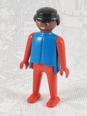Mann mit blauem Oberkörper, rote Arme und Beine, dunkle Haut, rote Hände fix