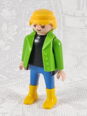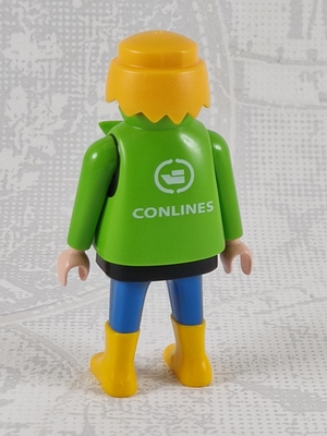 Mann in grüner Jacke mit dem Aufdruck "CONLINES" auf dem Rücken, schwarzer Pulli, blaue Hose, gelbe Stiefel