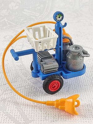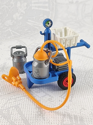 Melkmaschine Basis blau: 30224142, Rahmen blau: 30224152, Motor silber: 30081440, Felge rot: 30224162, Hohlreifen schwarz: 30823790, Radachse rot: 30222742, Körbchen weiß: 30231440, Melkschlauch orange: 30826192, Euteraufsatz orange: 30224172, Milchkanne silber: 30609290