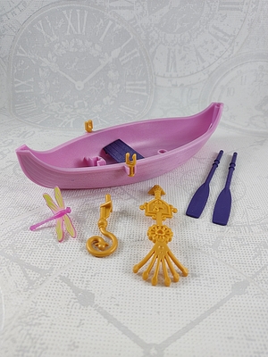 Ruderboot rosa:30089762, Sitzbank d.lila: 30089772, Paddel d.lila: 30089782, Paddel-Halter gold: 30256953, zwei Stangen-Ornamente gold: 30610312, Libelle rosa/gelb: 30634963