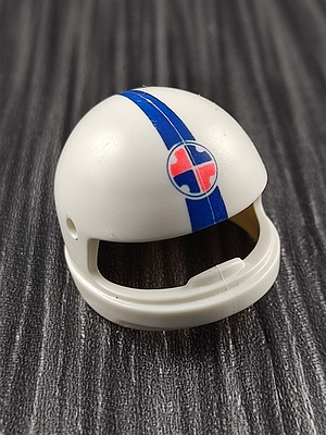 weißer Helm mit Aufdruck: blauer Streifen, Kreis rot/blau