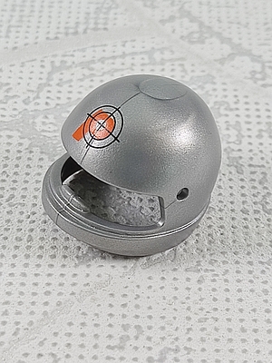 silberner Helm mit Aufdruck: Kreise mit Kreuz und orangenes p