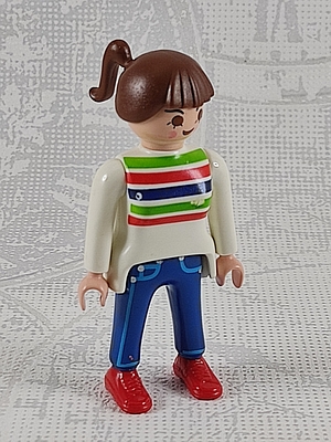 Frau, Mutter, weißer Pulli mit Streifen (rot, grün und blau)
