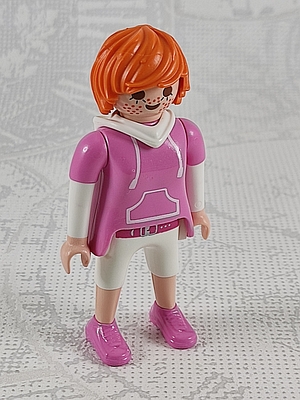 Frau, orange Haare, rosa T-shirt mit weißer Kapuze, kurze, weiße Hose, Sommersprossen