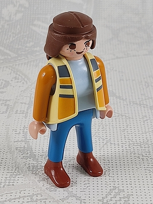 Frau mit hellgelber, gestreifter Weste, blaue Hose