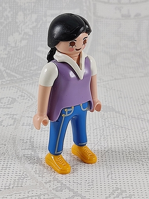Frau in lila T-Shirt mit weißem V-Kragen, blaue Hose, gelbe Schuhe