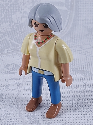 Frau mit grauen Haaren, gelbe Bluse und blaue Hose, aufgedruckte Halskette