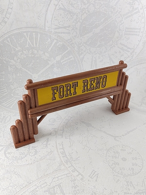 braunes Holzschild aus Baumstämmen mit Aufdruck "FORT RENO"
