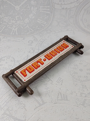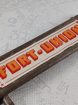 d.braunes Holzschild aus Baumstämmen mit Aufdruck "FORT - UNION"