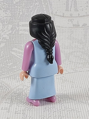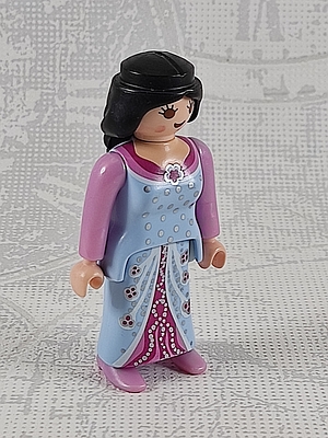 Frau in langem, blau/rosa Kleid mit silbernen Applikationen