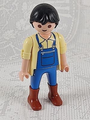 Mann, gelber Pulli mit hochgekrempelten Ärmeln, blaue Latzhose