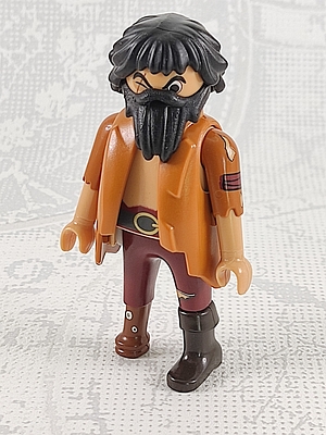 Pirat mit langer, brauner Weste, rot-braune Hose, Holzbein, ein Auge geschlossen, schwarze Haare und Bart