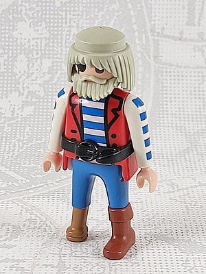 Mann in roter Weste, blau/weiß getreifter Pulli, blaue Hose, braunes Holzbein, graue Haare und Bart, Augenklappe, Gürtel