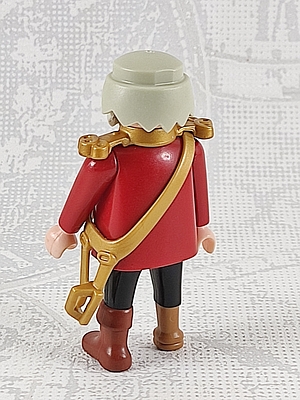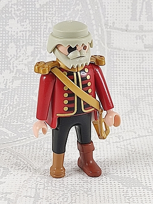 Mann in d.roter Uniformjacke mit zwei goldenen Knopfreihen, goldener Schultergurt und Schulterklappen, braunes Holzbein, aufgedruckte Augenklappe, graue Haare und Bart